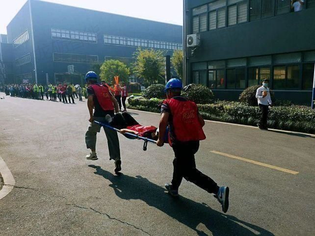 There are two competition links. The first part is to rescue the wounded, and the second part is for three people to complete the connection of three water belts and release the water. Each team has 3 members of 1 wounded (female) and 2 rescuers (male). The process of the race is to put the stretcher on the starting line and allow the "wounded" to lie down and fasten the seat belt. The other two rescuers lifted the stretcher and began to transport the wounded. After arriving at the designated place, the three water belts and opened the fire hydrant to drain the water.