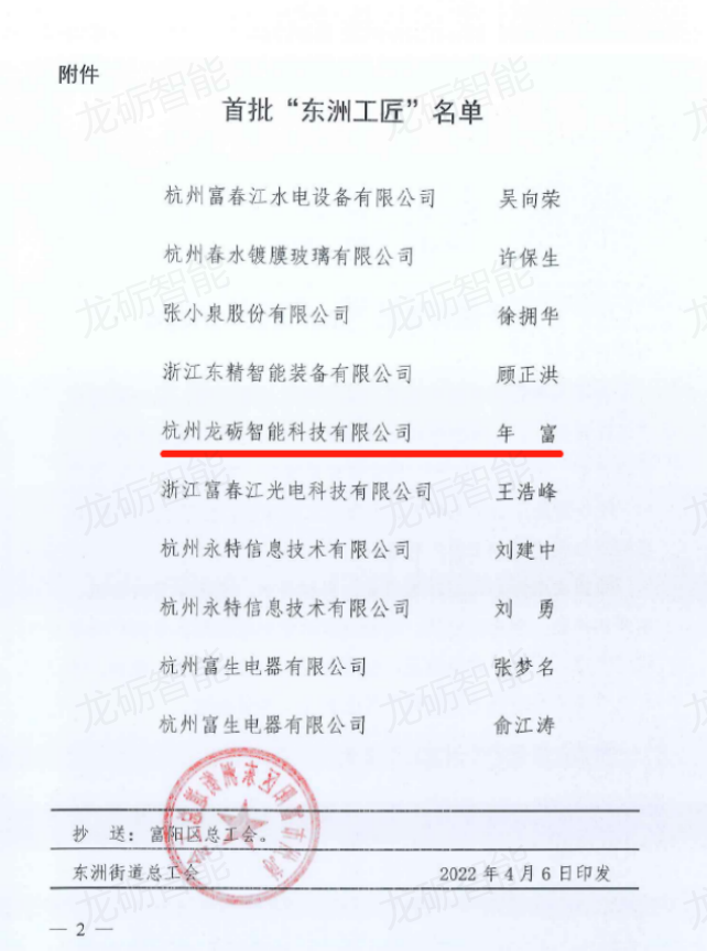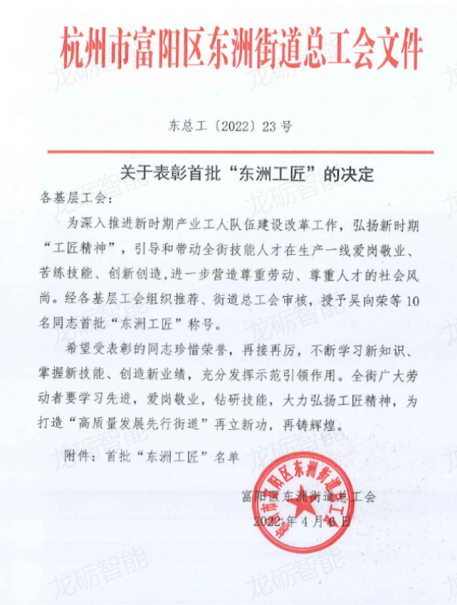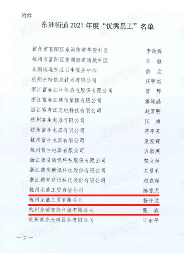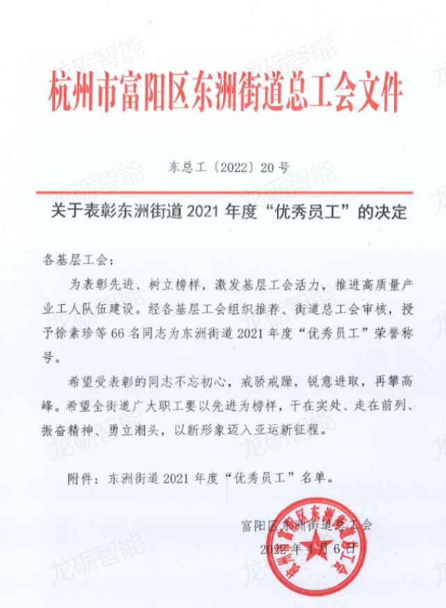 On April 6th, the Dongzhou Street Federation of Trade Unions in Fuyang District issued the Decision on Commending the "Outstanding Employees" of Dongzhou Street in 2021 and the Decision on Commending the First Batch of "Dongzhou Craftsmen". Chen Kuanlong and Yang Xulong, employees of Hangzhou Longsheng Industry and Trade Co., Ltd., and Zhang Binrong, employees of Hangzhou Longli Intelligent Science and Technology Co., Ltd., were awarded the title of "Excellent Employee" of Dongzhou Street in 2021, Hangzhou Longli Intelligent Technology Co., Ltd. has won the first batch of "Dongzhou Craftsman" titles for its employees who are young and wealthy. We hope that the above comrades will be humble and cautious, guard against arrogance and impatience, fully play the role of pioneers and models, help each other, realize personal value, and work hard for the vigorous development of the enterprise.